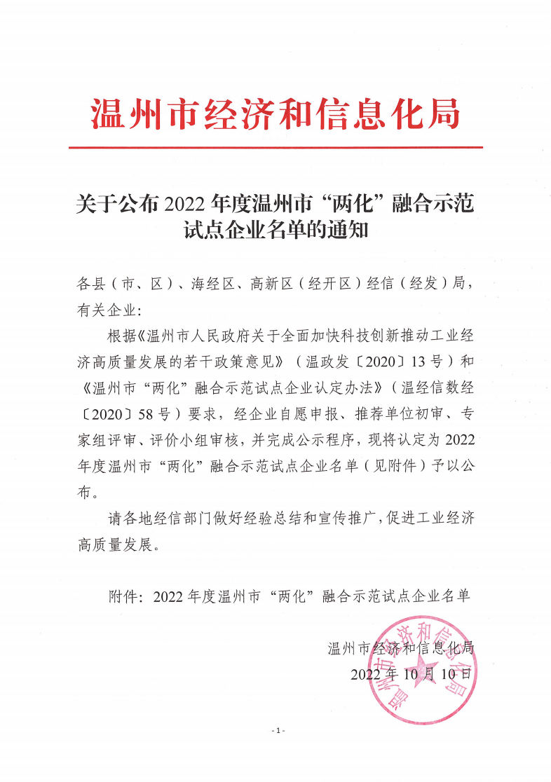 關(guān)于公布2022年度溫州市“兩化”融合示范試點企業(yè)名單的通知