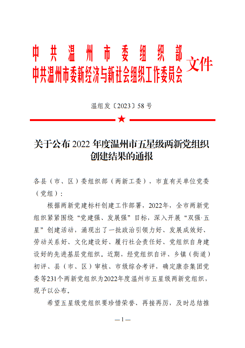 關(guān)于公布2022年度溫州市五星級兩新黨組織創(chuàng)建結(jié)果的通報
